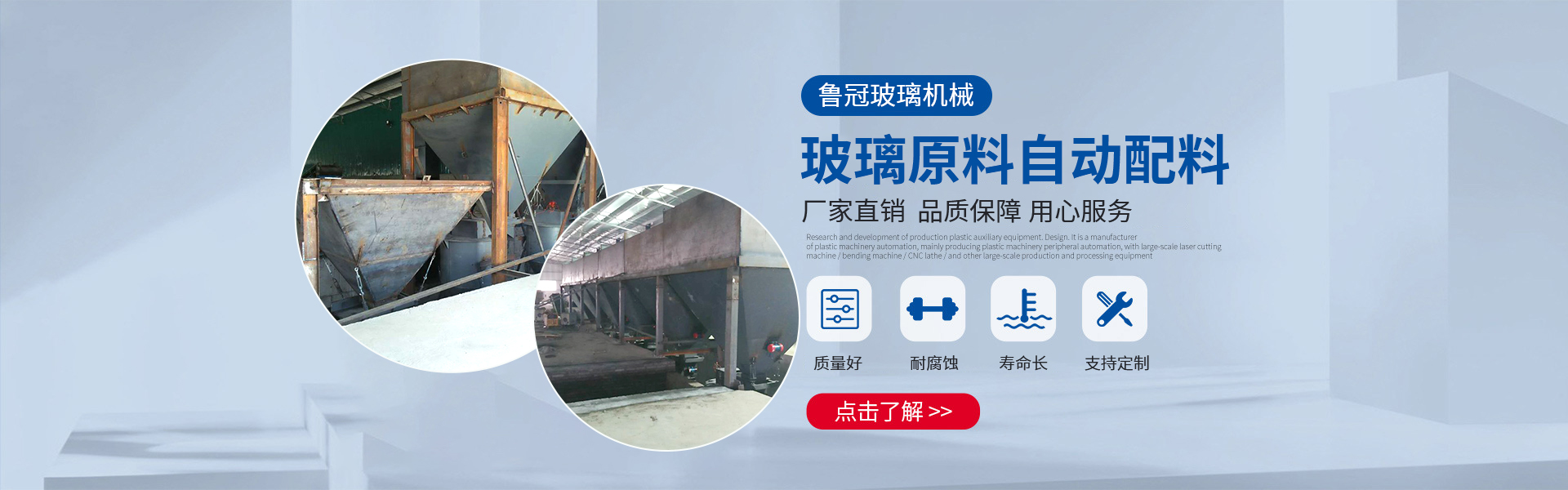 山東魯冠玻璃機(jī)械有限公司主要從事玻璃機(jī)械設(shè)備的生產(chǎn),其中玻璃加料機(jī),玻璃混料機(jī),玻璃原料自動(dòng)配料,烘干機(jī)械以及輸送機(jī)械等產(chǎn)品暢銷多個(gè)城市,在玻璃制品行業(yè)上有較高的位置。山東魯冠玻璃機(jī)械有限公司具備良好的整體素質(zhì)和一定的技術(shù)力量,歡迎有烘干機(jī)械設(shè)備,輸送機(jī)械設(shè)備需求的來(lái)廠參觀咨詢。企業(yè)始終堅(jiān)持“科學(xué)技術(shù)是重要生產(chǎn)力”的主導(dǎo)思想,不斷加大新產(chǎn)品研發(fā)力度,玻璃機(jī)械產(chǎn)品的開(kāi)發(fā)生產(chǎn),為適應(yīng)玻璃制品行業(yè)發(fā)展需要,相繼先后研制出:斜毯式加料機(jī)、懸掛式加料機(jī)、強(qiáng)制式混合機(jī)等幾十種產(chǎn)品,暢銷各地,深受用戶歡迎。 ... ...